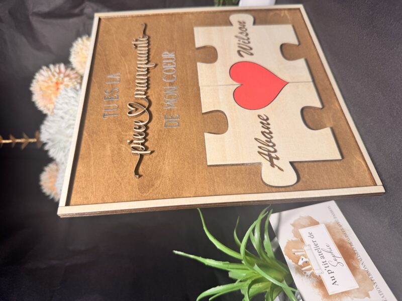 Un cadre de 20×20 cm, imaginé comme un puzzle, personnalisé avec les prénoms, pour dire l’essentiel avec douceur (et beaucoup d’amour).