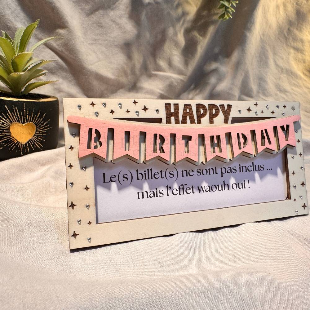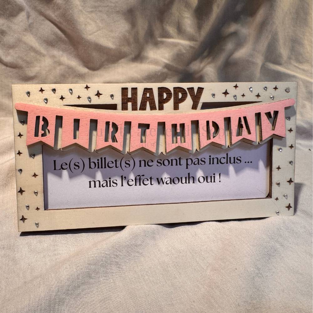 Ici l’enveloppe en bois “Happy birthday” est très girly avec ses strass