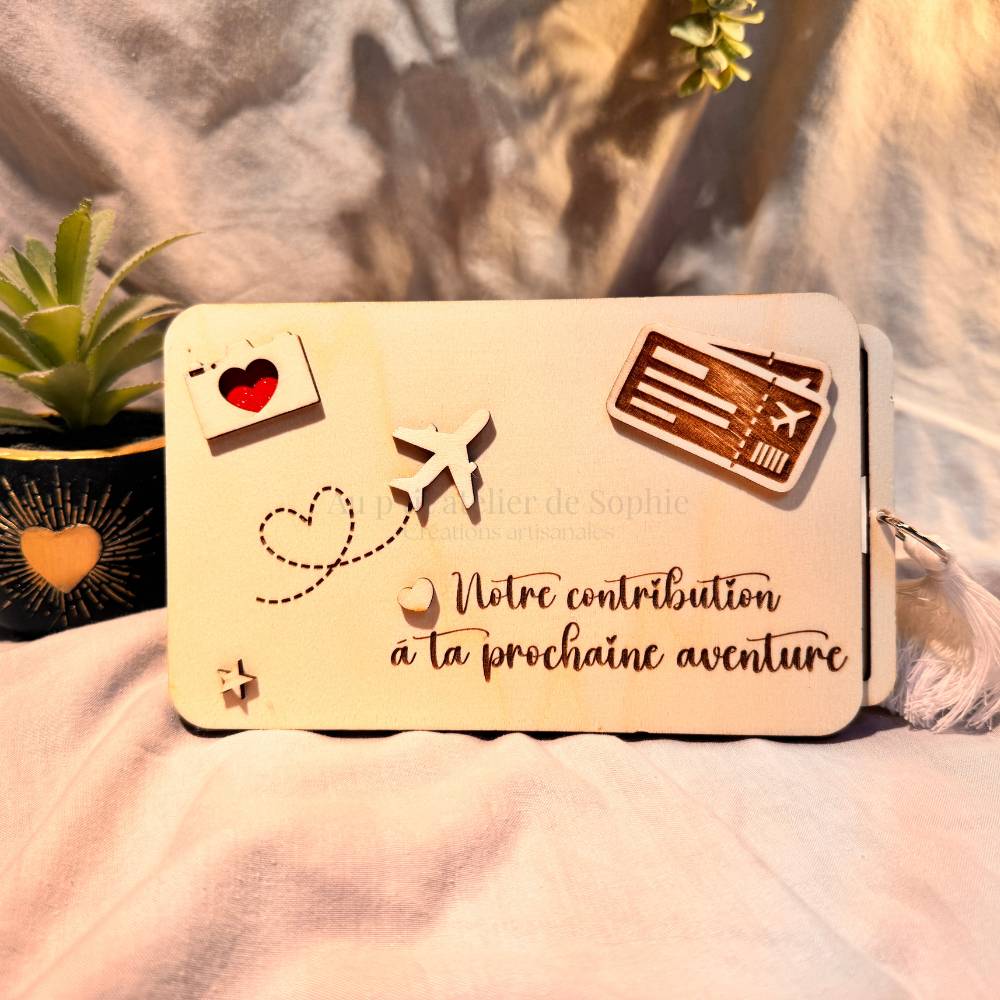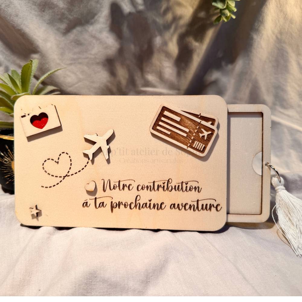 Ici l’enveloppe en bois “notre contribution à ta prochaine aventure” ✈️
