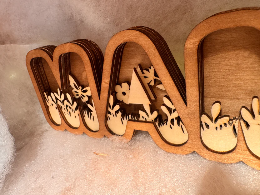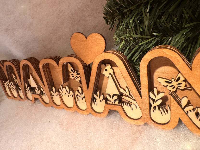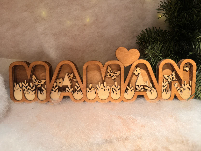 Découpé, poncé, assemblé et collé directement dans notre atelier, ce joli mot en bois multicouches est prêt à prendre place sur une étagère, un buffet ou même sous le sapin.